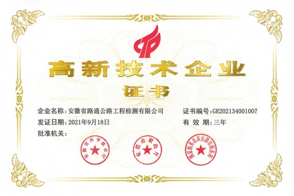 12月14日,安徽省交通建設股份有限公司下屬全資子公司安徽省路通公路工程檢測有限公司(以下簡稱路通檢測公司或公司)喜獲“高新技術企業”榮譽,標志著路通檢測公司正...